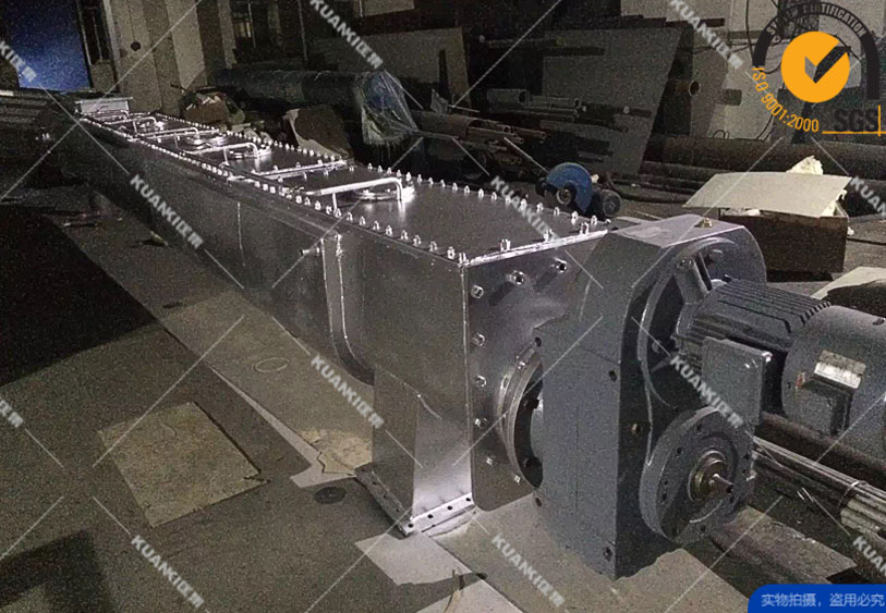 水平螺旋输送机是利用旋转的螺旋将被输送的物料沿固定的机壳内推移而进行输送工作,头部及尾部轴承移至壳体外,吊轴承采用滑动轴承设有防尘密封装置,轴瓦一般采用粉末冶金,输送水泥采用毛毡轴瓦,吊轴和螺旋轴采用滑块连接。